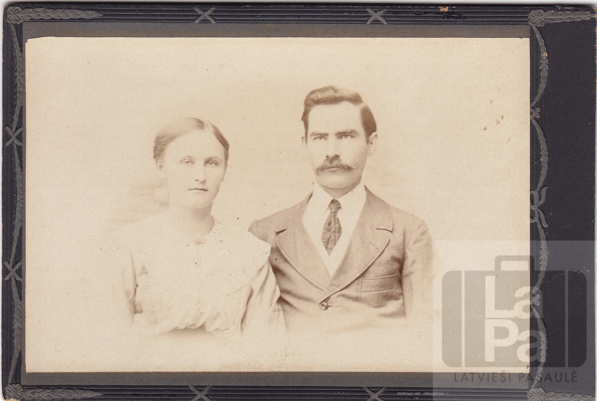 Vilis Leimanis ar sievu Lūciju. Otrā pusē ar pildspalvu uzraksts: "Vilis un Lūcija (dz. Osis no Rionovas) Leimaņi".
