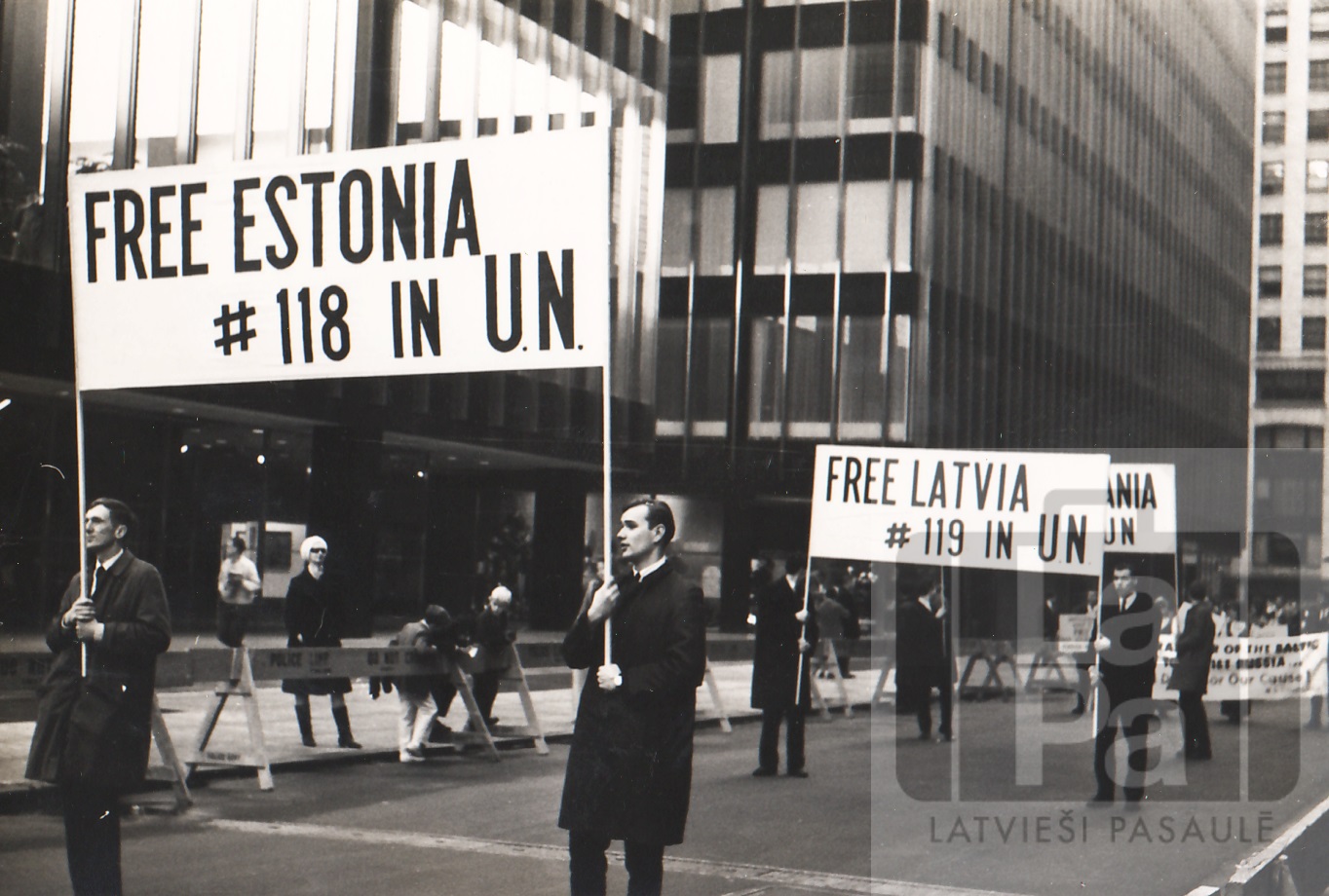 Baltiešu demonstrācija Ņujorkā 1965. gada 13. novembrī. Plakātus nes: no kreisās M. Kļaviņš, M. Kurēns (?), J. Lazdiņš.
