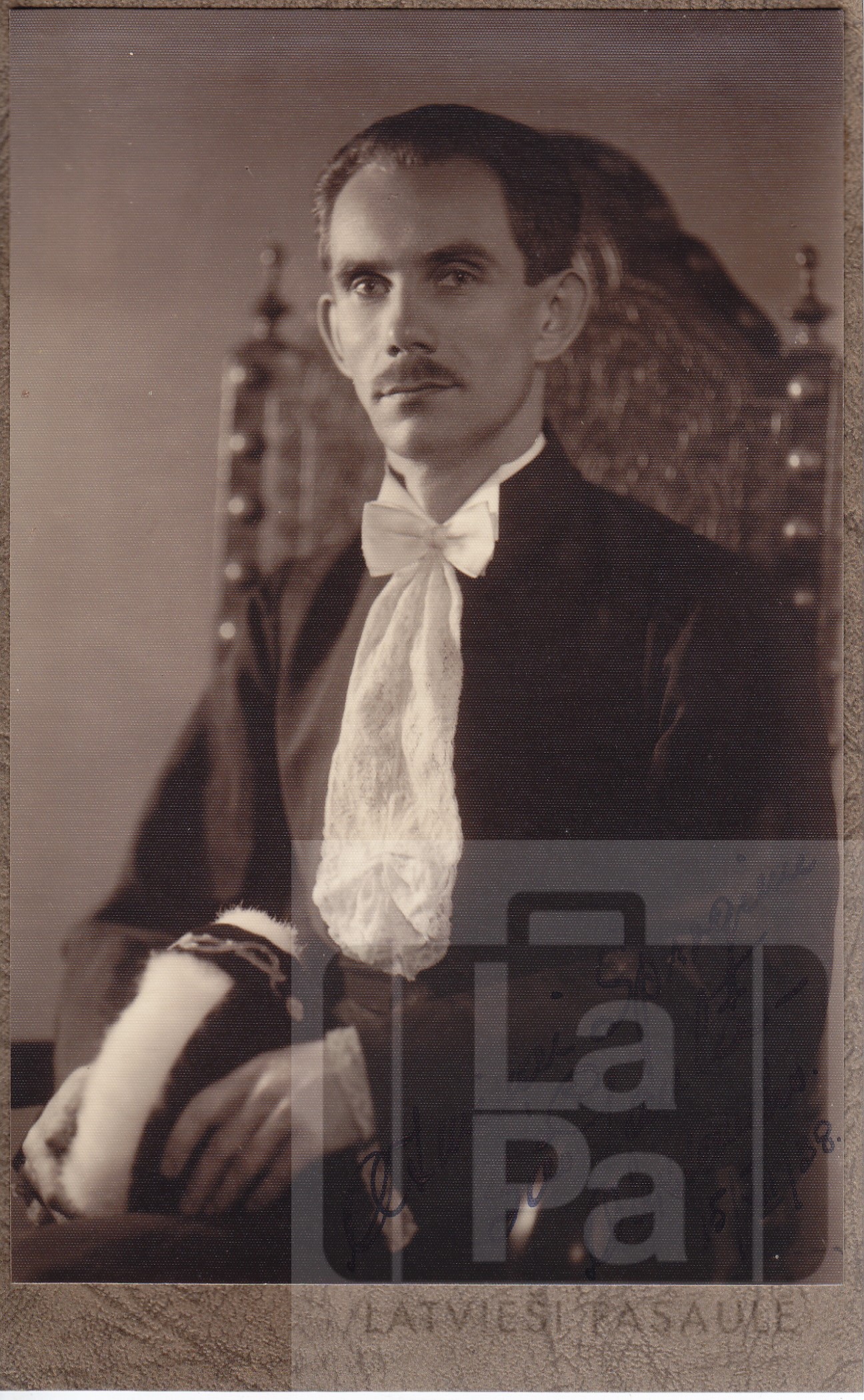 Salonfotogrāfija. Pirmā Rionovas latviešu baptistu draudzes mācītāja Aleksandra Kļaviņa dēls Pauls Aleksandrs Kļaviņš. Uz fotogrāfijas tumšā fona: "Atmiņai Sproģiem Sao Paulā – Aleksandrs. 15/XII/38."