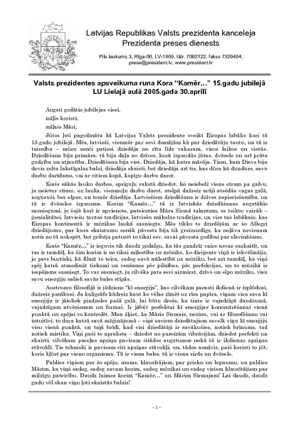 Valsts prezidentes apsveikuma runa Kora “Kamēr…” 15.gadu jubilejā LU Lielajā aulā 2005.gada 30.aprīlī