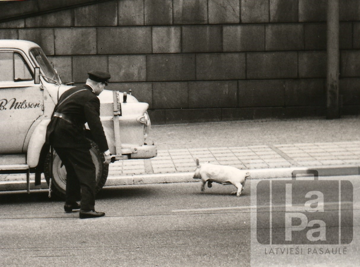 Policists mēģina noķert palaistu sivēnu (saukts arī par "sarkano sivēnu"), uz kā uzzīmēta Hruščova karikatūra un pretpadomju saukļi. Protesta akcijā piedalījās Vija Pole (Freimane), Jānis Veidemanis, Jānis Brēdermanis u.c. Sivēns tika palaists Hruščova viesošanās laikā Stokholmā 1964. gada jūnijā, netālu no karaļa pils. Sivēns bija ieziests ar eļļu, lai to grūtāk noķert.