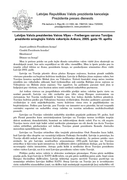 Latvijas Valsts prezidentes Vairas Vīķes – Freibergas uzruna Turcijas prezidenta sniegtajās Valsts vakariņās Ankara, 2005. gada 19. aprīlis