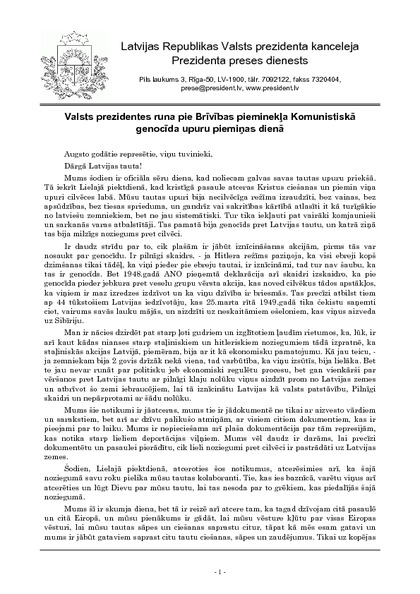 Valsts prezidentes runa pie Brīvības pieminekļa Komunistiskā genocīda upuru piemiņas dienā