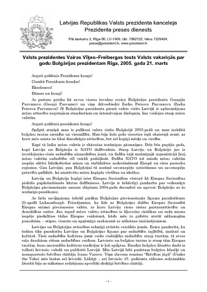 Valsts prezidentes Vairas Vīķes–Freibergas tosts Valsts vakariņās par godu Bulgārijas prezidentam Rīga, 2005. gada 21. marts