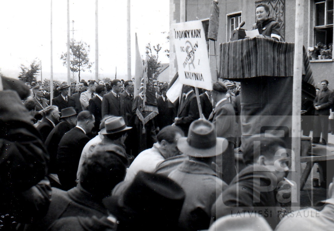 Uzruna pretpadomju demonstrācijā Cufenhauzenā pie Štutgartes Vācijā. Šajā demonstrācijā piedalījās tūkstošiem bēgļu no vairākām bēgļu nometnēm. Priekšā plakāts poļu valodā "Żądamy kary (nelasāms) Katynia" – Vajag sodīt (komunistus) par Katinu".