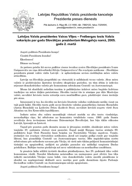 Latvijas Valsts prezidentes Vairas Vīķes – Freibergas tosts Valsts vakariņās par godu Slovākijas prezidentam Melngalvju namā, 2005. gada 2. martā