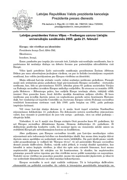 Latvijas prezidentes Vairas Vīķes – Freibergas uzruna Lielajās universālajās sanāksmēs 2005. gada 21. februārī