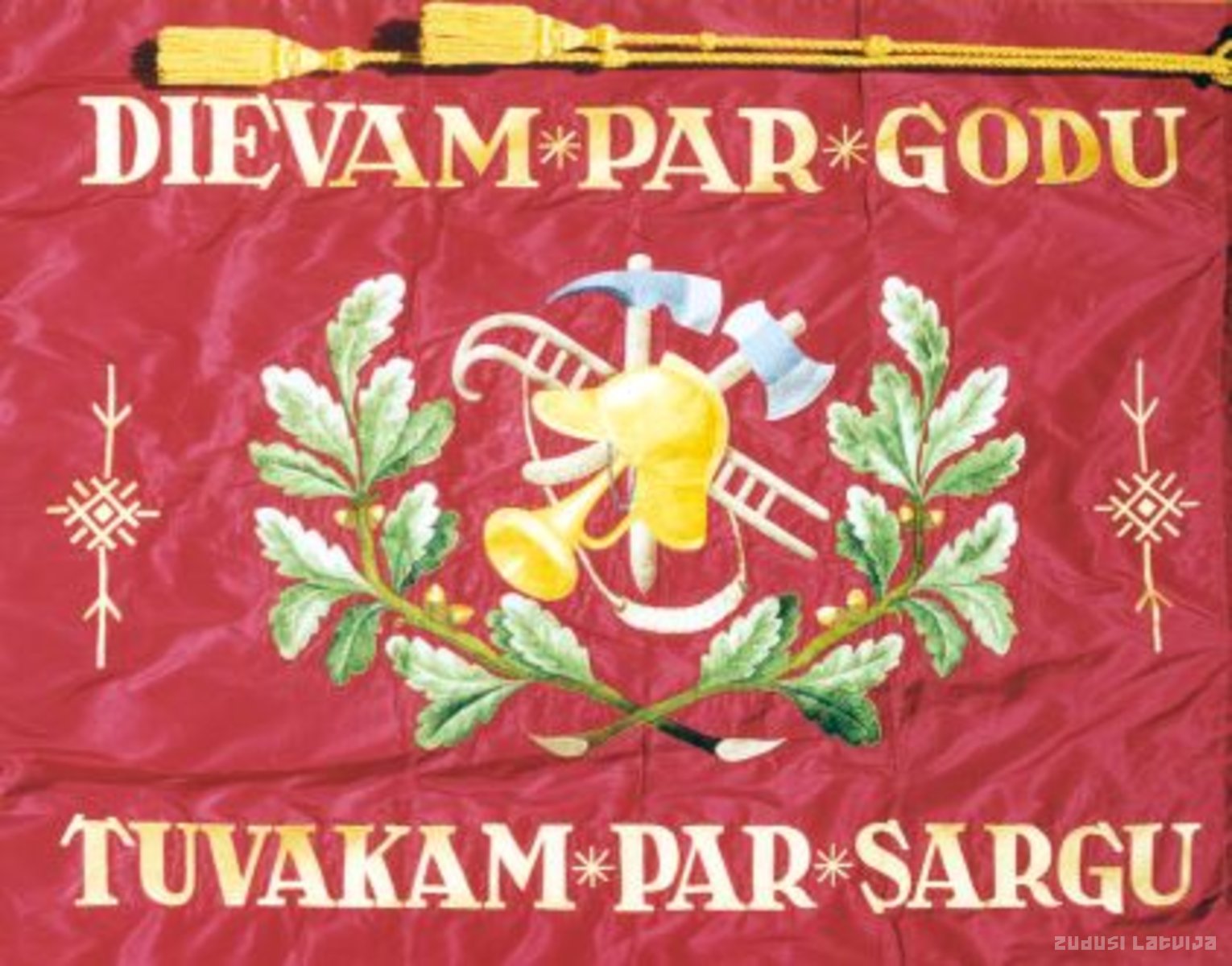 Smiltenes pilsētas brīvprātīgo ugunsdzēsēju biedrības karogs. Reverss. Biedrība dibināta 1895. gadā Uz karoga izšūti vārdi: "Dievam par godu - tuvākam par sargu"