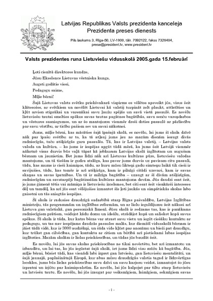 Valsts prezidentes runa Lietuviešu vidusskolā 2005.gada 15.februārī