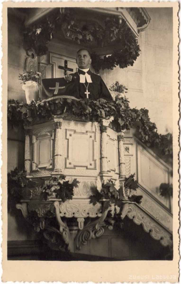 Priekules baznīcas kancele ap 1935. gadu. Priekules baznīca tika uzcelta ap 1680.gadu. 1792. gadā tā vēlreiz pārbūvēta un lieli remonti veikti 1852. gadā, kad no jauna apgleznoja un apzeltīja altāri un kanceli. 1895. gadā Priekules baznīcai, iebūvētas jaunas Rīgas meistara Mārtiņa darinātas ērģeles. Visus atjaunošanas izdevumus apmaksājis Priekules barons Nikolajs Korfs. Otrā pasaules kara laikā līdz ar lielāko pilsētas daļu baznīca tika sagrauta. Bojā aizgāja arī savdabīgā baznīcas iekārta. Baznīca atjaunota 20. gadsimta beigās, pilnībā pabeidzot darbus 1998. gadā