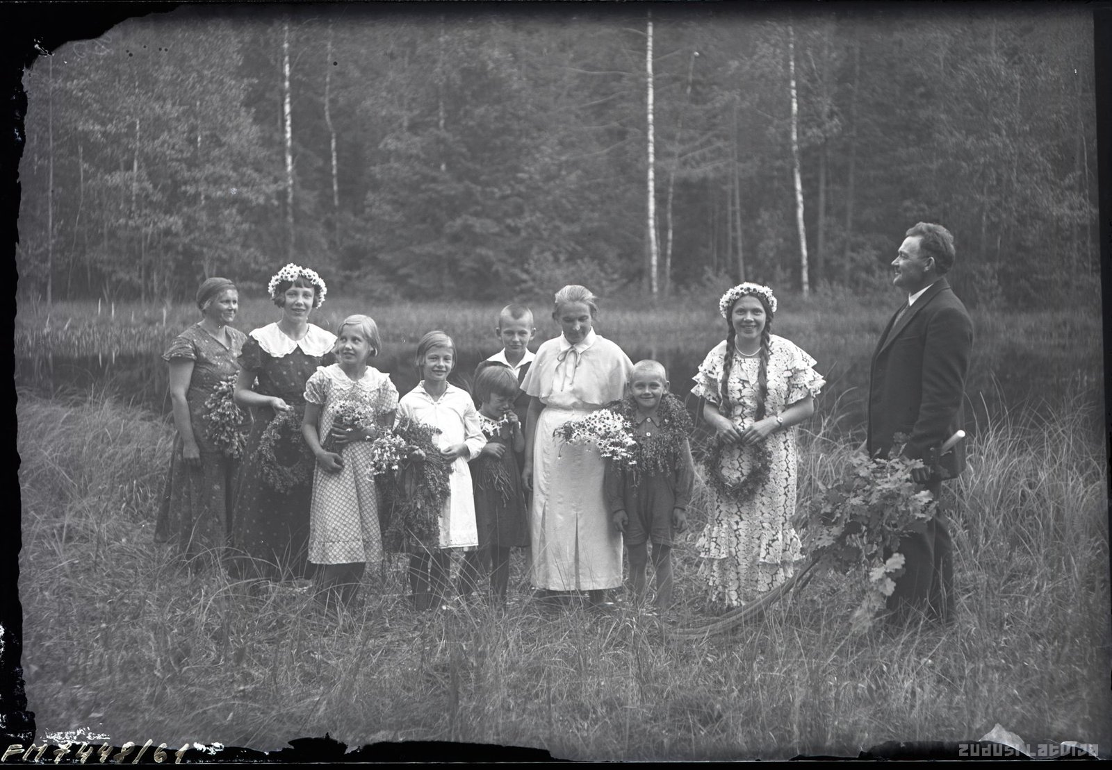 Līgotāji stāv pļavā ar Jāņu zālēm un sapītiem puķu vainagiem. 20. gadsimta 20. gados