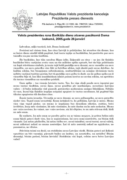 Valsts prezidentes runa Barikāžu dienu atceres pasākumā Doma laukumā, 2005.gada 20.janvārī