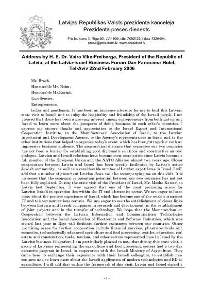 Address by H. E. Dr. Vaira Vike-Freiberga, President of the Republic of Latvia, at the Latvia-Israel Business Forum Dan Panorama Hotel, Tel-Aviv 22nd February 2006
