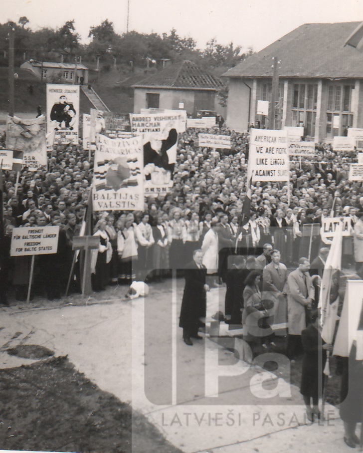 Pretpadomju demonstrācija Štutgartes priekšpilsētā Cufenhauzenā, Vācijā, 1949. gada 15. maijā. Demonstrācijā piedalījās aptuveni 5000 bēgļu, ieskaitot latviešus no Eslingenas bēgļu nometnes, kuri nesa valstu karogus un pretpadomju plakātus. Fotogrāfijā redzami plakāti angļu, vācu un latviešu valodā: "Lai dzīvo neatkarīgas Baltijas valstis!", "American Friends, we are fighting like Lincoln against slavery" (Amerikas draugi, mēs cīnāmies kā Linkolns pret verdzību) u. c.