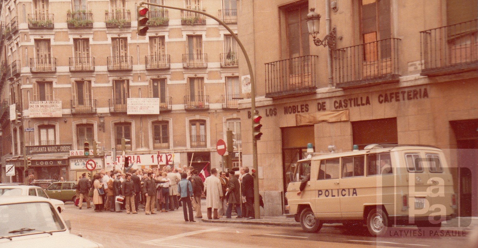Latvieši pulcējas pie Madrides pašvaldības Plaza Segovia Nueva uz demonstrāciju Eiropas drošības un sadarbības konferences laikā 1980. gadā.