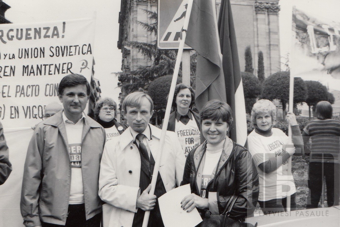 Demonstrācija Madridē, Eiropas drošības un sadarbības konferences laikā 1980. gada 10.–11. novembrī. No kreisās: Vilis Vītols, no Lietuvas izraidītais disidents Vladas Šakalis (Šakalys), Marta Vītola, Aija Spilnere. Pārējās personas nezināmas.