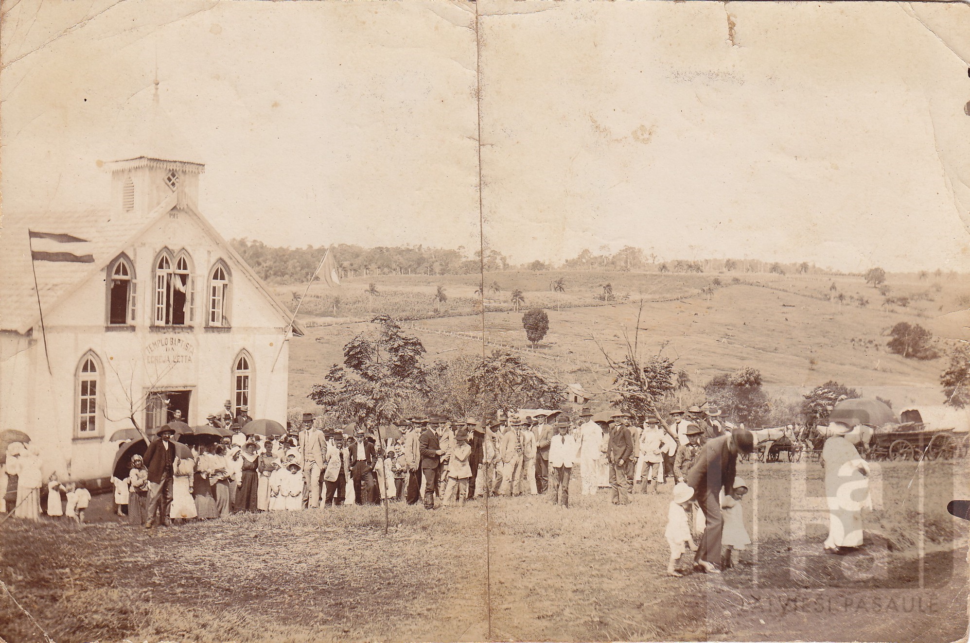 Ižuī latviešu baptistu baznīca 20. gadsimta 20.–30. gados. 11.līnijā Ižuī, Brazīlijā. Uz baznīcas uzraksts "Templo Baptista da Egreja Letta" un gadskaitlis 1917. Pie baznīcas Brazīlijas un Latvijas karogi.