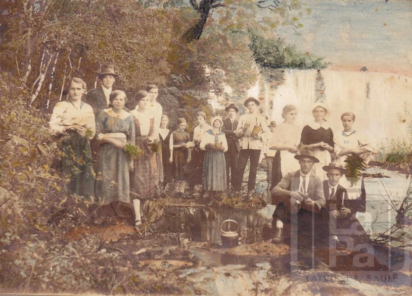 Jaunieši pie ūdenskrituma Brazīlijā. Priekšā no kreisās pirmais tup Valdemārs Garozs, pirmā stāv Matilde Kronberga (?). Priekšā mate tējas kanna. Jaunekļiem labajā pusē rokā ir mate tējas dzeramie trauki (chimarao). Fotogrāfija krāsota. Aptuveni 20. gadsimta sākums.