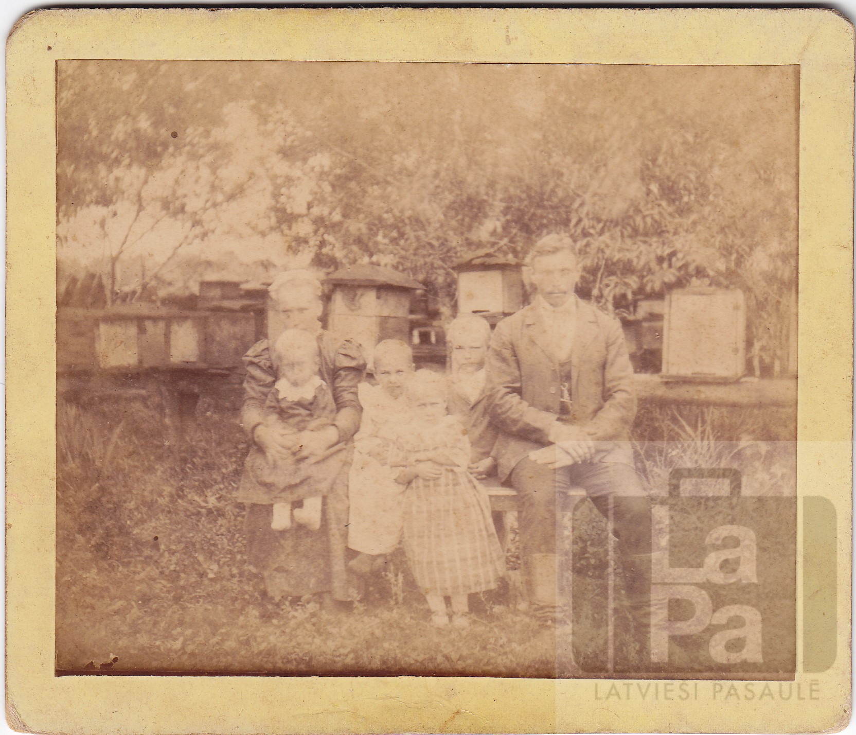 Ižuī kolonisti Līna (dzimusi Ukstiņa) un Žanis Ķeidāni ar bērniem Aleksandru (mātei klēpī), Līnu, Lidiju, Rūdolfu. 19. gadsimta 90. gadu beigas.