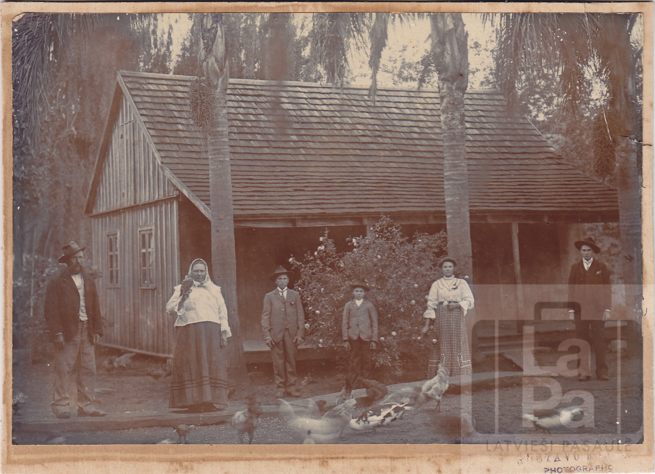 Jāņa Grimma māja Ižuī 11. līnijā. No kreisās: Jānis Grimms, Līna Grimma, Heinrihs (Indriķis) Nikolajs Grimms, Rūdolfs Grimms, Kate Danele un Jēkabs Grimms. Ap 1909.–1910. gadu. Fotogrāfa zīmols: "Foto: Gustavo R. Elke".
