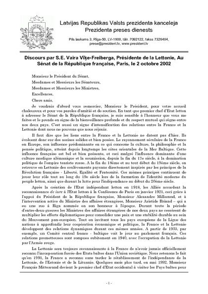 Discours par S.E. Vaira Vīķe-Freiberga, Présidente de la Lettonie, Au Sénat de la République française, Paris, le 2 octobre 2002