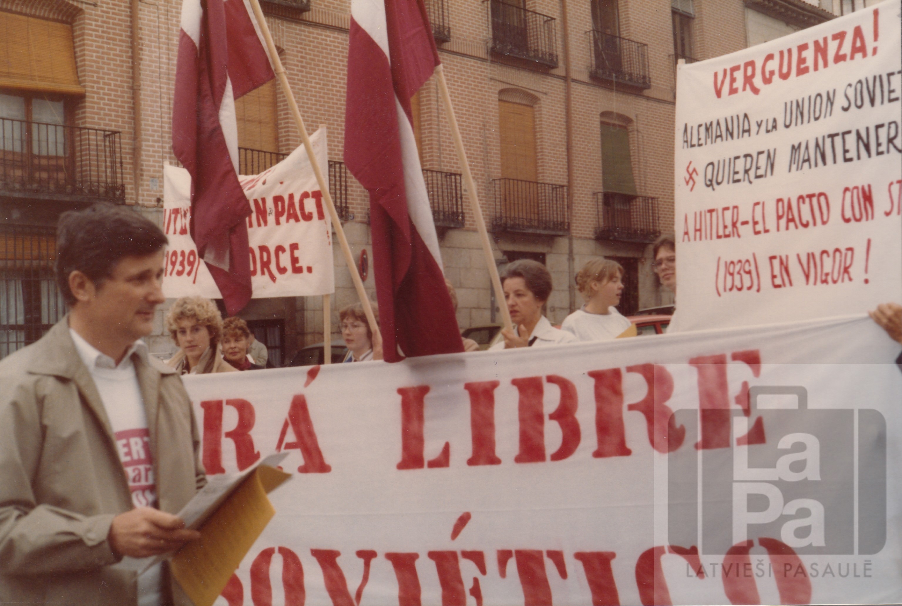 Vilis Vītols demonstrācijā Eiropas drošības un sadarbības konferences laikā Madridē, 1980. gada 11. novembrī. Plakāts spāņu valodā, tulkojums: KAUNS! VĀCIJA UN PADOMJU SAVIENĪBA GRIB UZTURĒT SPĒKĀ HITLERA-STAĻINA PAKTU (1939).