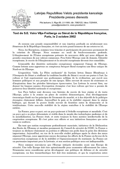 Tost de S.E. Vaira Vīķe-Freiberga au Sénat de la République française, Paris, le 2 octobre 2002