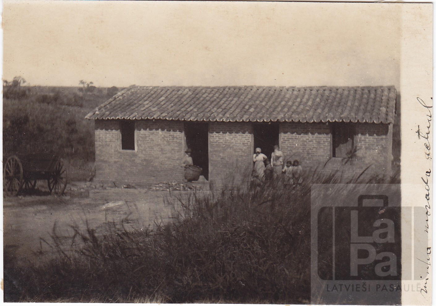Uz fotogrāfijas uzraksts portugāļu valodā: "Minha morada actual" ("Mana tagadējā dzīvesvieta"). Otrā pusē: "Victoria Kreplin Krepliņu mājās. Patīkamu, priecīgu un daudz Dieva svētībām jauno gadā vēlē tavs draugs M.E. Priedols. 1 – 1- 1925."