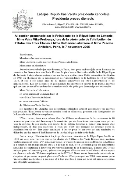 Allocution prononcée par la Présidente de la République de Lettonie, Mme Vaira Vīķe-Freiberga, lors de la cérémonie de l’attribution de l’Ordre des Trois Étoiles à Mme Catherine Lalumière et Mme Pascale Andréani, Paris, le 7 novembre 2005