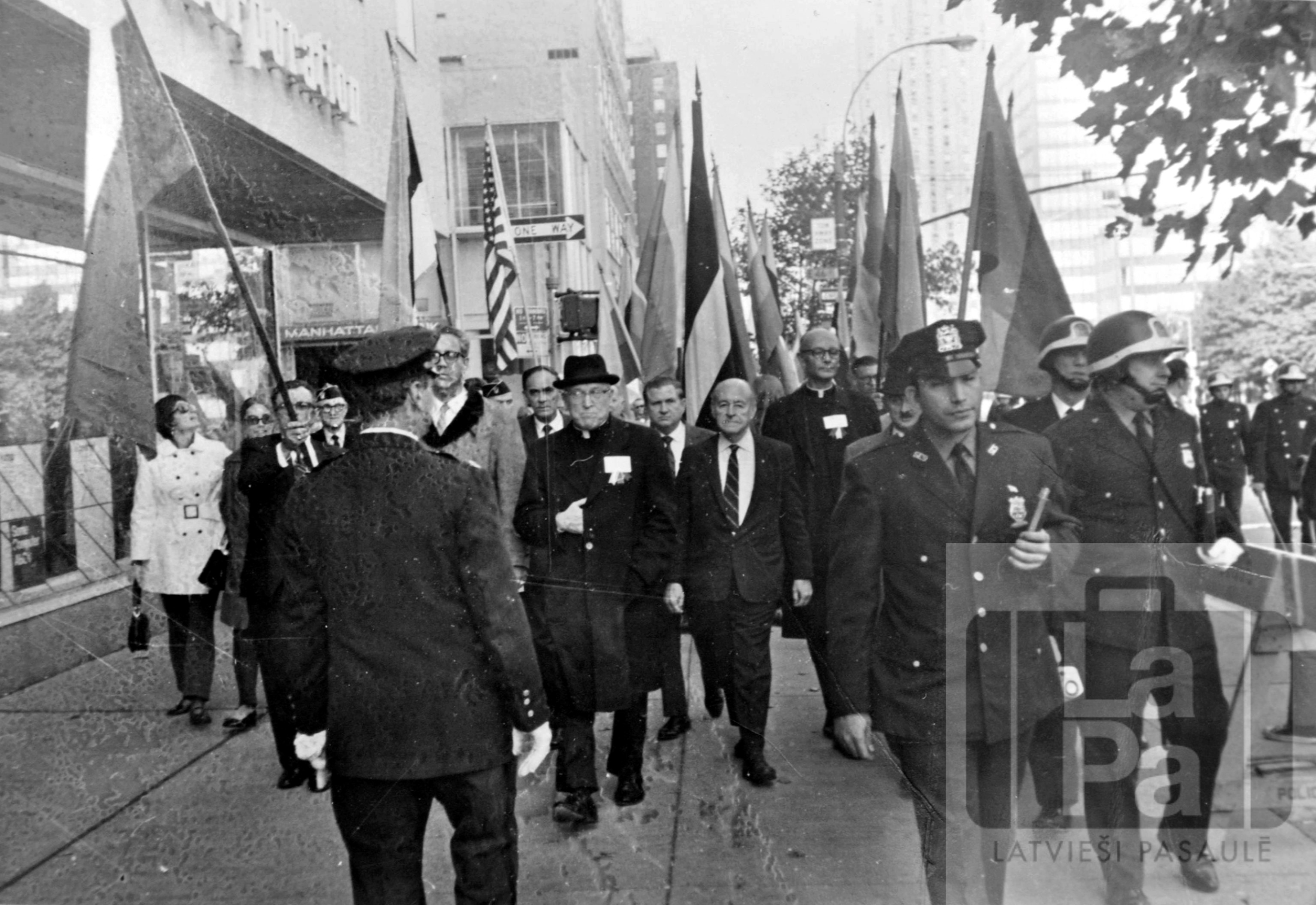 Prelāts Jonas Balkūnas vada baltiešu demonstrāciju Ņujorkā