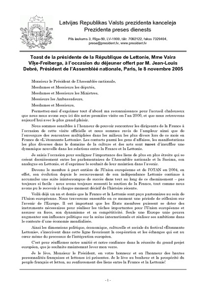 Toast de la présidente de la République de Lettonie, Mme Vaira Vīķe-Freiberga, à l’occasion du déjeuner offert par M. Jean-Louis Debré, Président de l’Assembléé nationale, Paris, le 8 novembre 2005