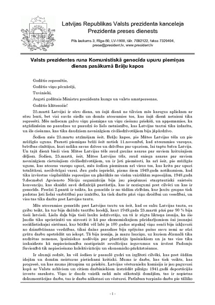 Valsts prezidentes runa Komunistiskā genocīda upuru piemiņas dienas pasākumā Brāļu kapos