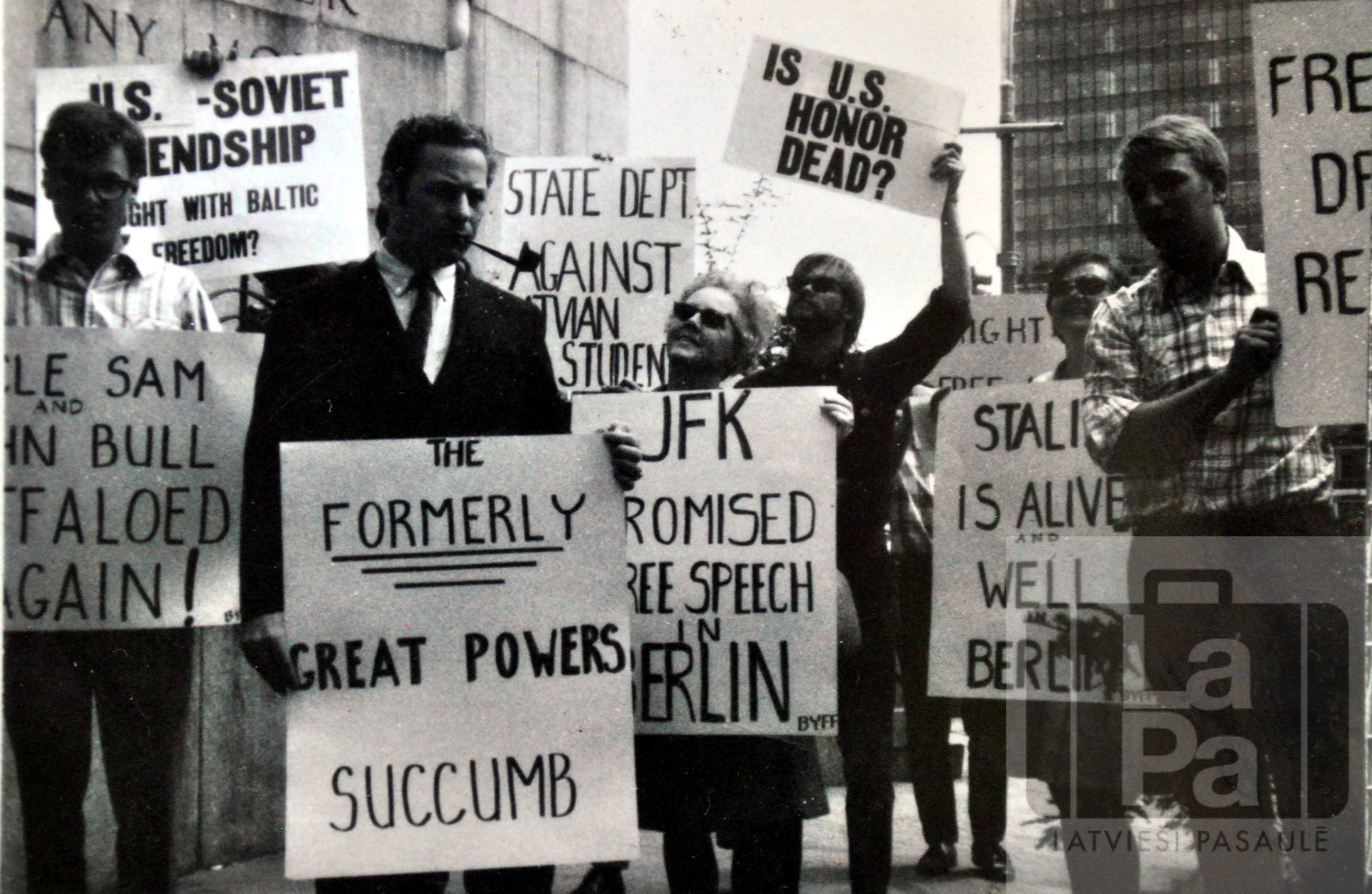BYFF (Baltic Youth for Freedom) rīkotā demonstrācija 1968. gada vasarā pret Rietumu sabiedroto lēmumu neatļaut Vispasaules latviešu jaunatnes kongresam sanākt Rietumberlīnē. Demonstrācija notika pie pie ANO ēkas Ņujorkā, ASV. No kreisās: nezināms, Māris Zaķis, Beatriče Klīve, Māris Čakars.