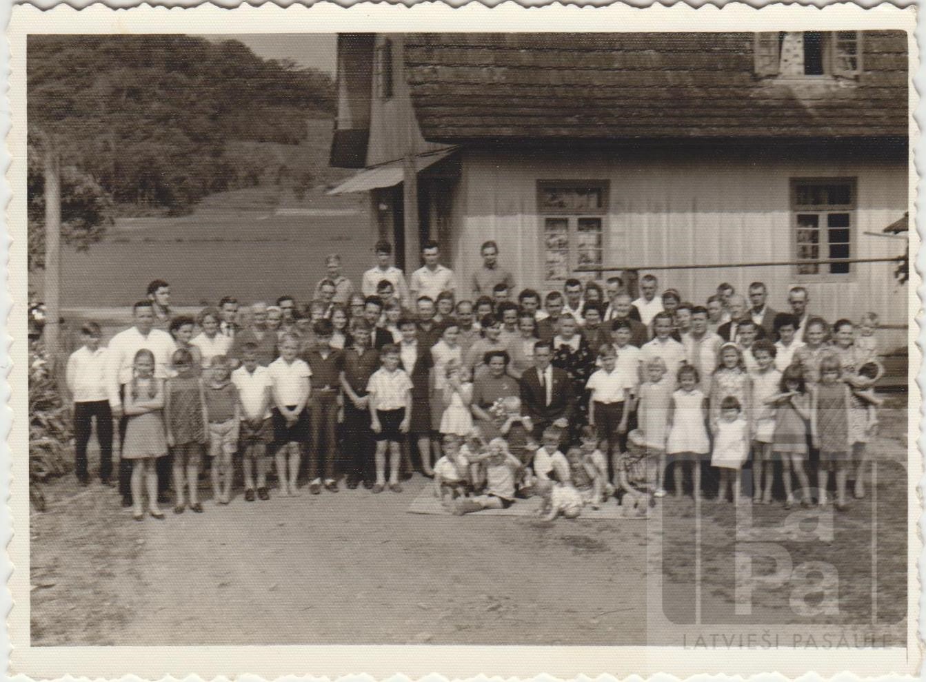 Ļaužu grupa stāv pie ēkas. Centrā redzams Brazīlijas latvieša, luterāņa Kārļa Lešinska dēls Eduards Lešinskis ar sievu Izolinu (dzimusi Morsch).