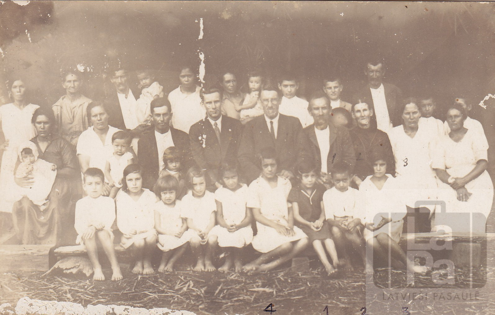 Latviešu baptisti Parikera – Assu (Pariquera – Açu) kolonijā. Iespējams, ar svētdienas skolas bērniem – brazīliešiem. No kreisās sēž: nezināms, nezināms, nezināms, 4. Emīls Andermanis (viesis) 5. baptistu sludinātājs Kārlis Kraulis (viesis), 6. Otto Indans, 7. Edde Indans, 8. Alvine Indans, 9. nezināms.