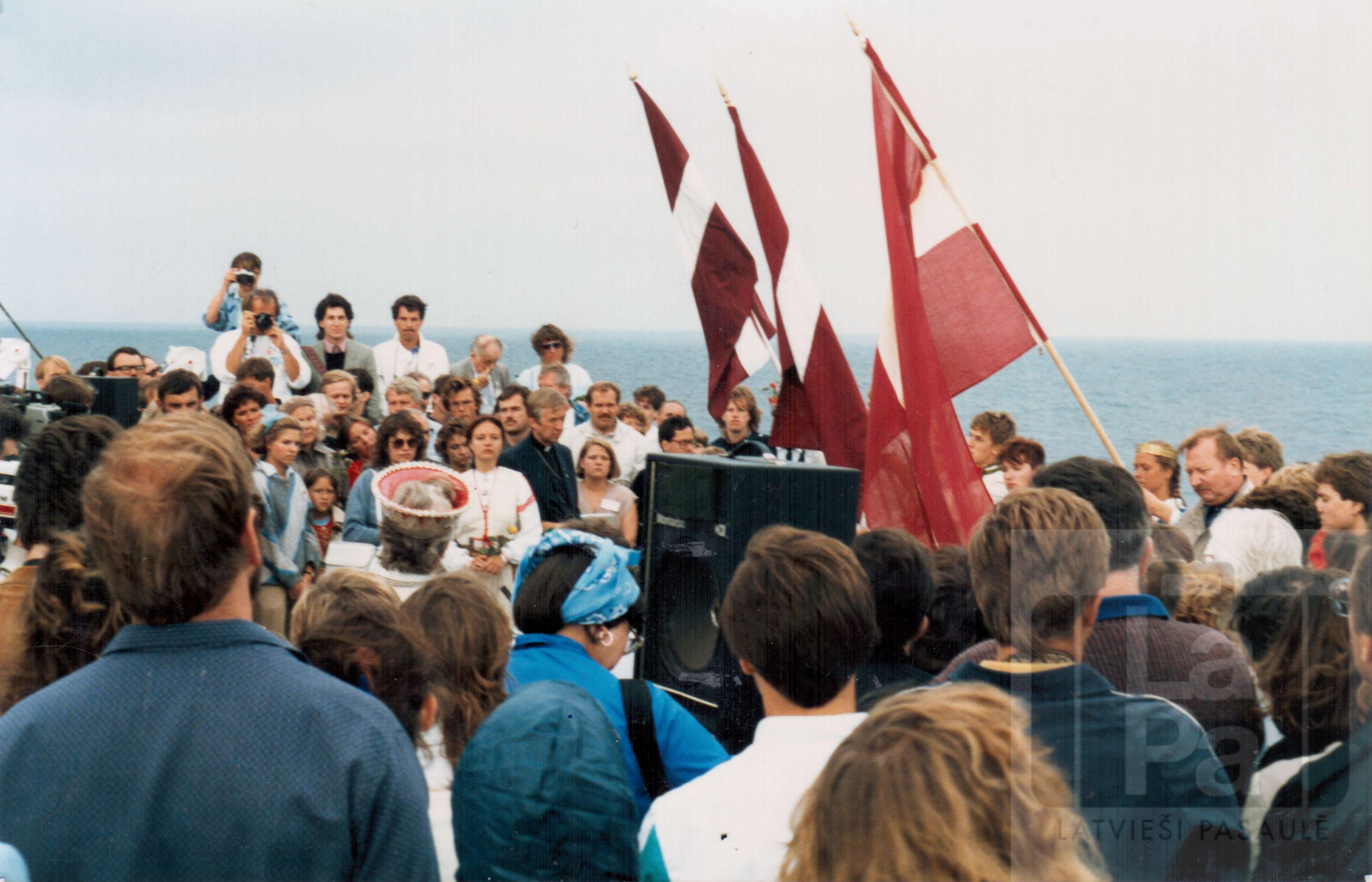 Svētbrīdis tuvojoties Latvijas krastiem Baltijas Brīvības un miera kuģa akcijas laikā 1985. gada 27. jūlijā. Vidū mācītājs Māris Ķirsons, pa labi no viņa Vita Tērauda.