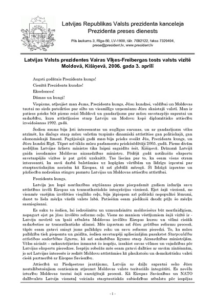 Latvijas Valsts prezidentes Vairas Vīķes-Freibergas tosts valsts vizītē Moldovā, Kišiņevā, 2006. gada 3. aprīlī