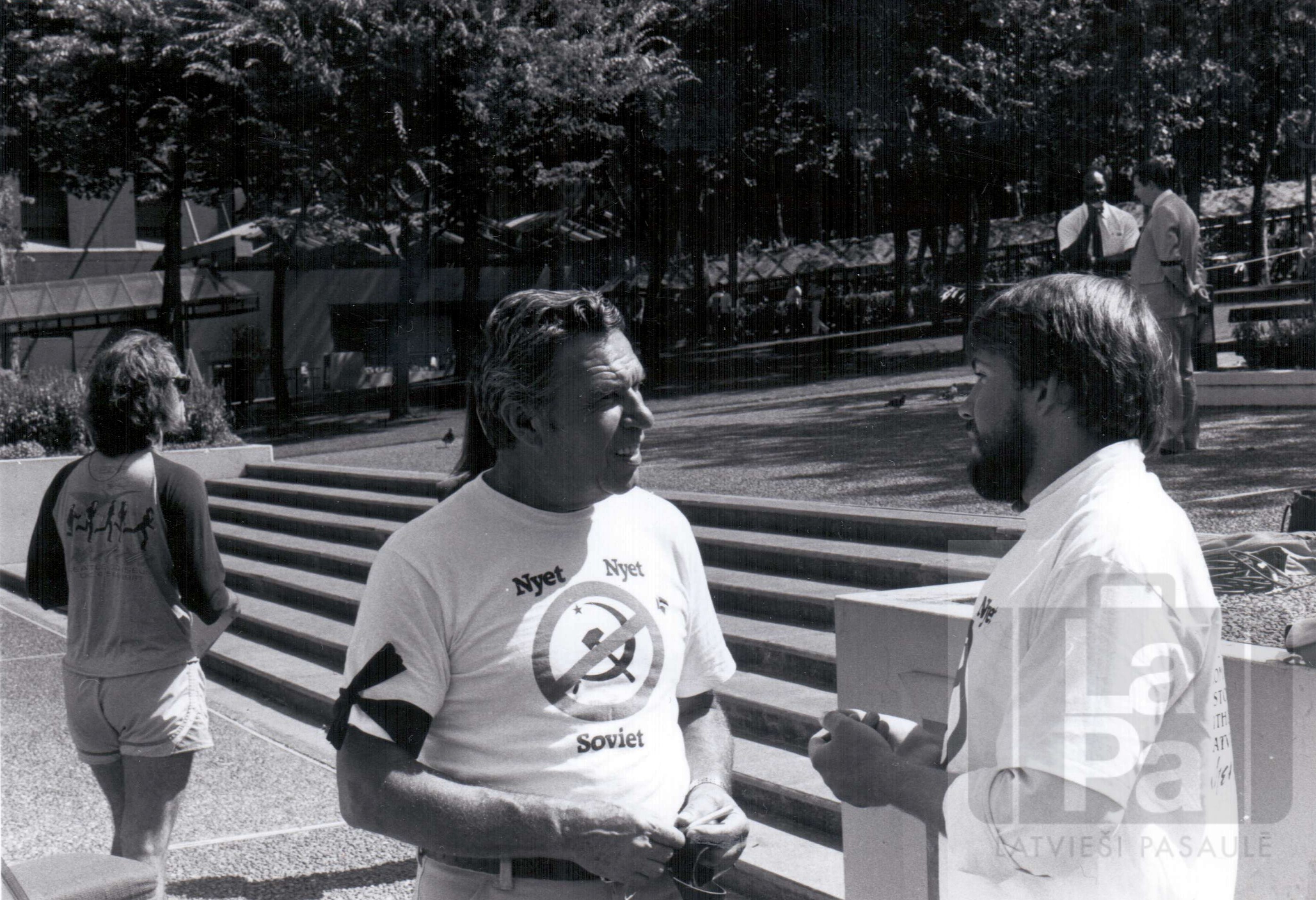 Pēteris Elferts sarunājas ar Amerikas Savienoto Valstu kongresa locekli Džonu Milleru (John Miller) Baltijas rīcības komitejas (Baltic Action Committee) rīkota akcijā Sietlā. 1990. vai 1991. gada 14. jūnijs.