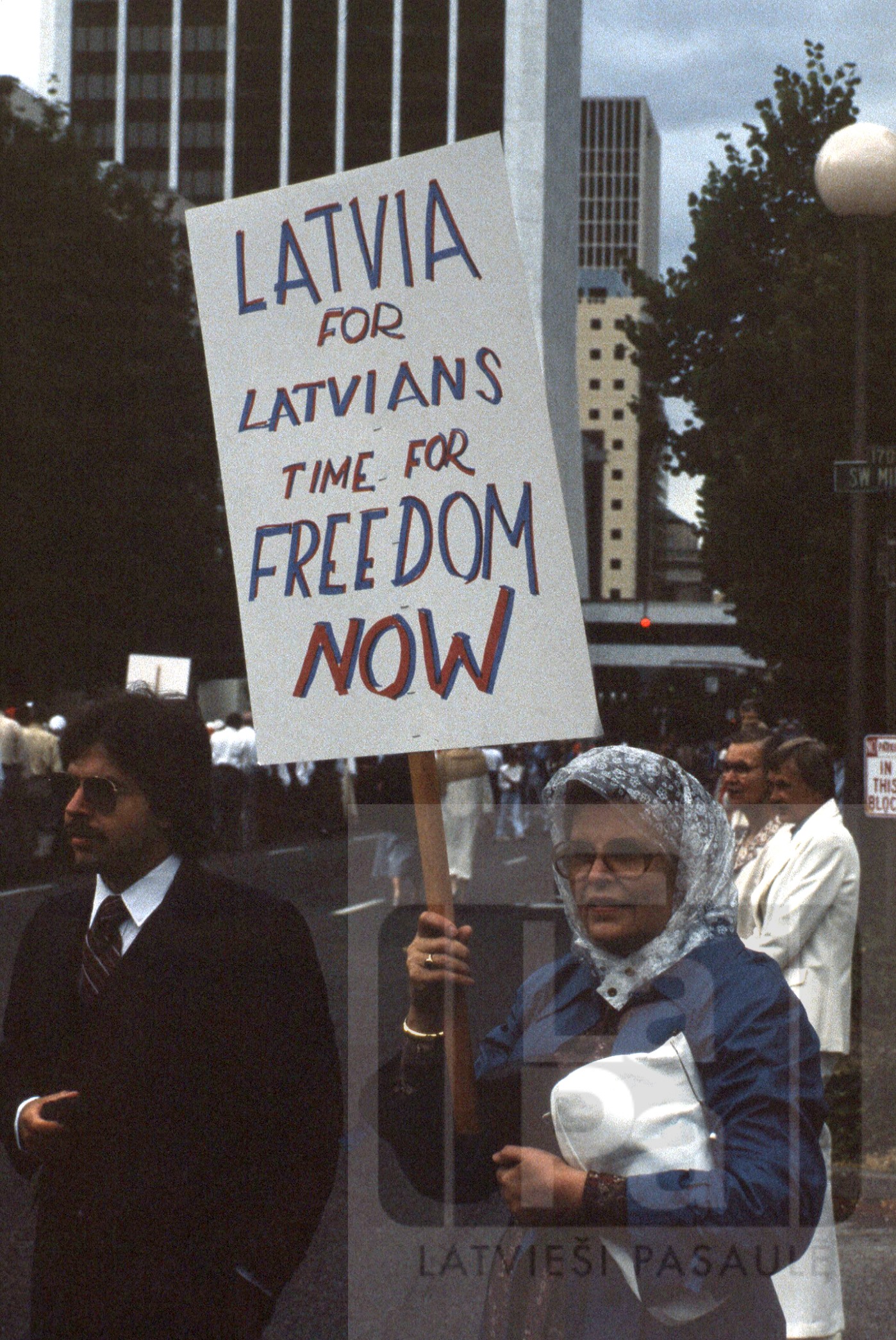 Veronika Elferte 6. Rietumkrasta latviešu dziesmu svētku gājienā Sietlā, turot plakātu "Latvija for Latvians, time for freedom now".