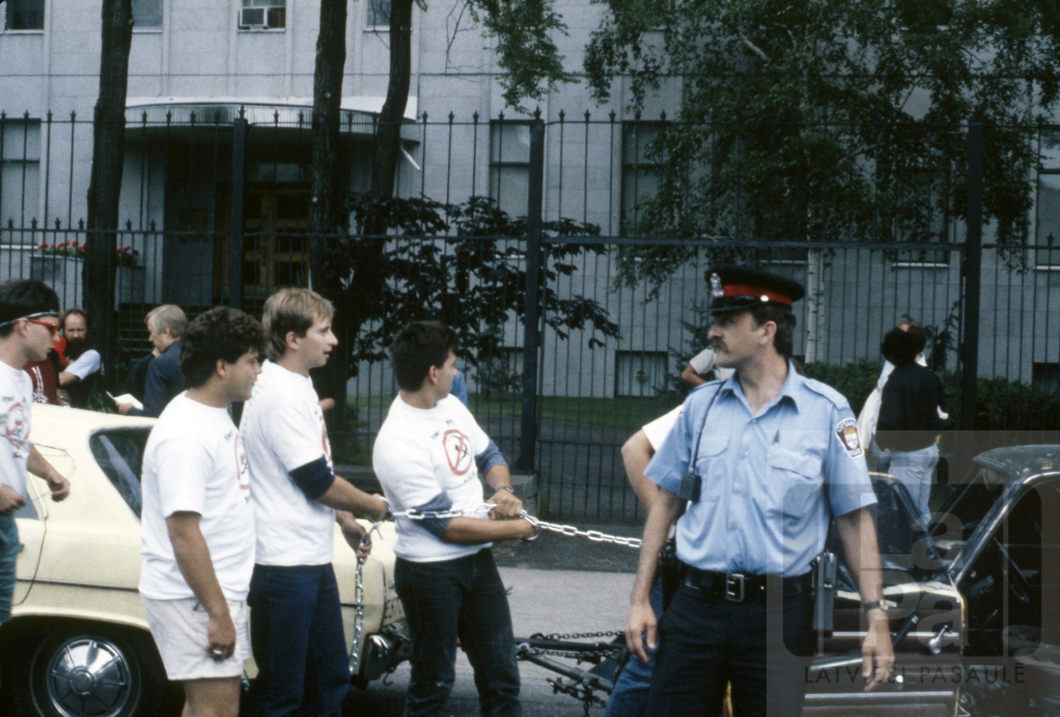 Ielu teātris 7. Vispasaules latviešu jauniešu kongresa laikā pie Padomju Savienības vēstniecības Otavā. Demonstrācijā izmantoja mašīnu (Padomju Savienībā ražoto VAZ ("žiguli"), izkrāsotu kā cietumu. No automašīnas lauzās ārā jaunieši "Nyet Nyet Soviet" kreklos un sadauzīja automašīnu. Ķēdi velk (no kreisās puses) Elmārs Tannis, Harijs Ozols, Ivars Slokenbergs.