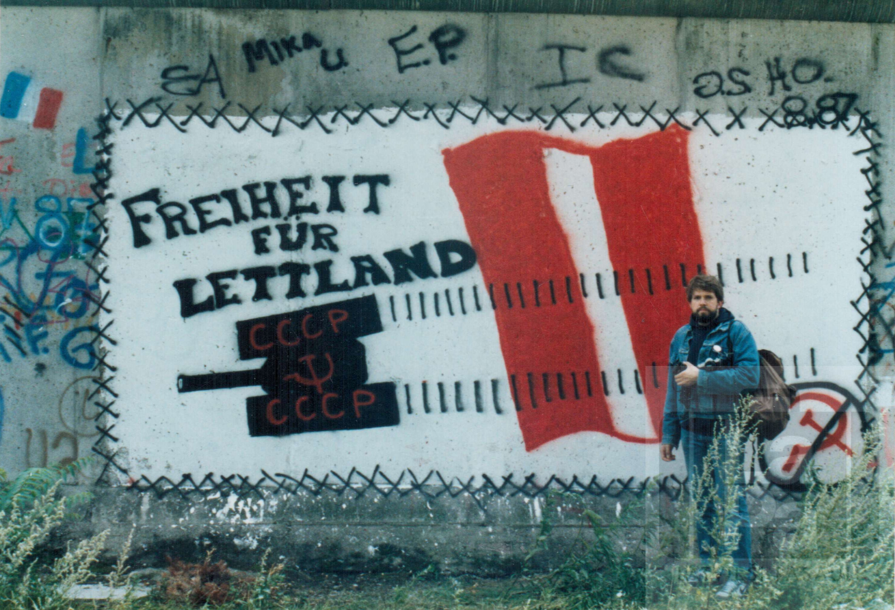 Pēteris Elferts pie Berlīnes mūra blakus uzrakstam "Freiheit fur Lettland" (Brīvību Latvijai) 1987. gadā. Savulaik būdams skolotājs un audzinātājs Minsteres latviešu ģimnāzijā Pēteris Elferts organizēja mūra krāsošanu ar pretpadomju saukļiem.