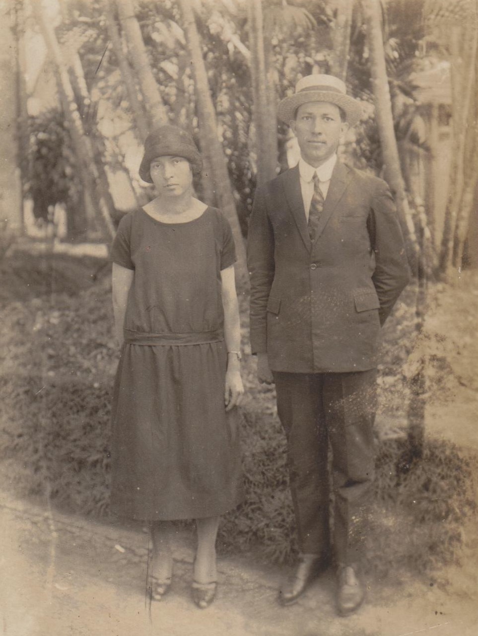 Žanis Sproģis ar māsu Emmu parkā Kampīnās, Brazīlijā. Otrā pusē rakstīts: "Snr. Joao Sprogis Nova Odessā. Campinas augustā 1925. g."