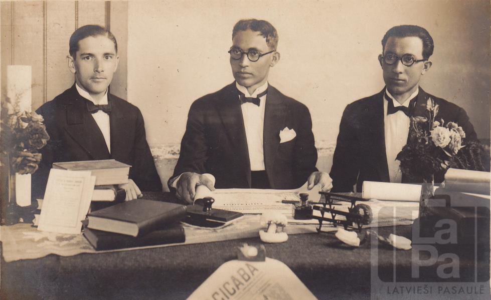 Latviešu zobārsti ar diplomiem 1928. vai 1929. gadā Pirasikabā (Piracicaba). No kreisās: Arnolds Šverns, Ernests Sproģis, Žanis Sproģis.