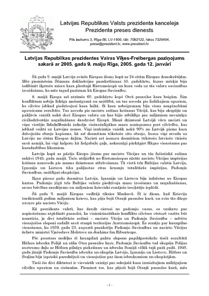 Latvijas Republikas prezidentes Vairas Vīķes-Freibergas paziņojums sakarā ar 2005. gada 9. maiju Rīga, 2005. gada 12. janvārī