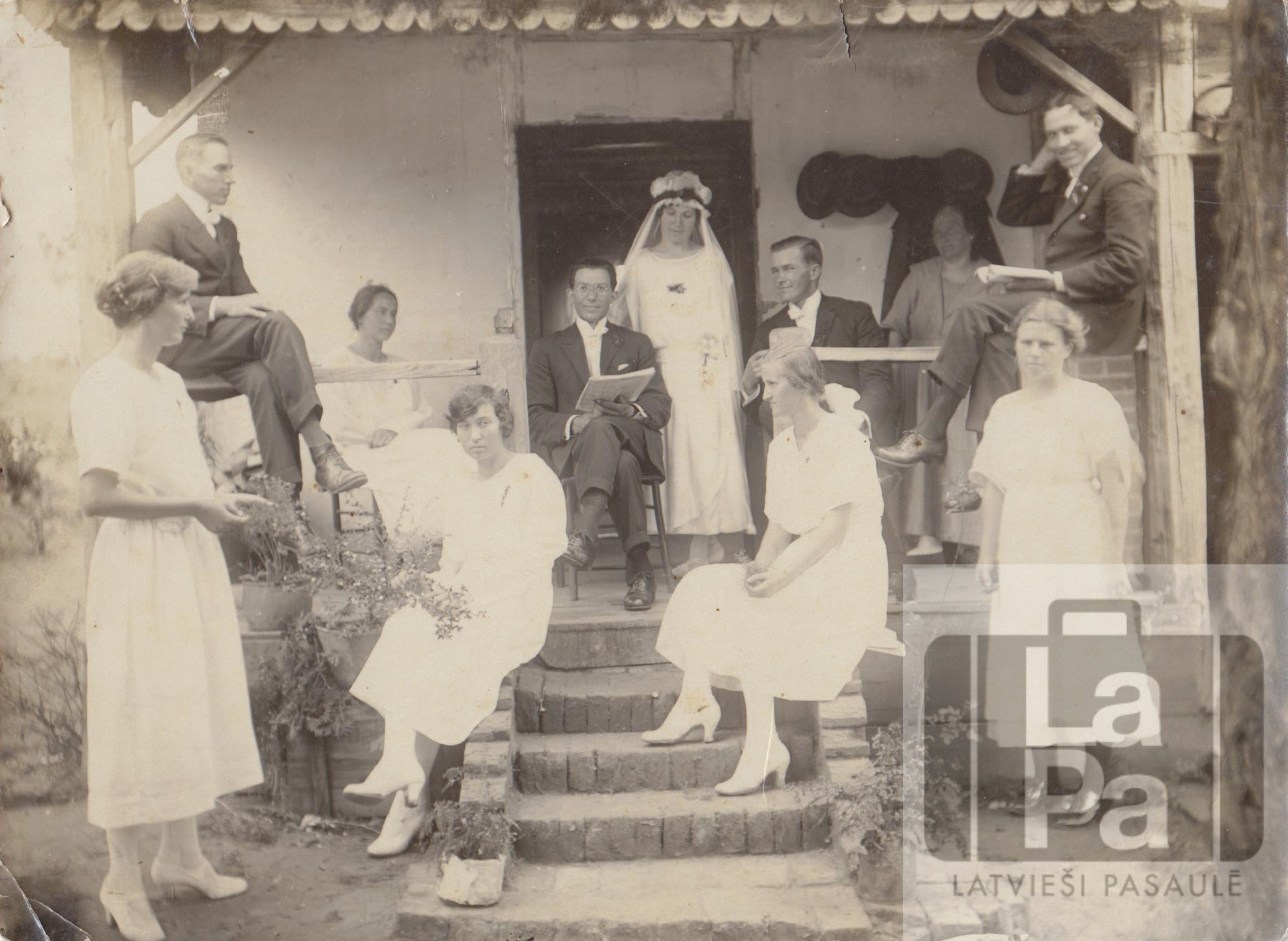 Augusta Kļavas un Emīlijas Sproģes kāzas 1923. gada 30. septembrī Fazenda Veļa (Novaodesa). Kāzinieki mājas verandā. Aizmugurē no kreisās: Gustavs Kārkls (sēž uz apmales), Žanis Sproģis, durvju ailā stāv līgava Emīlija Sproģis, pa labi no viņas sēž līgavainis Augusts Kļava, mamma, Ernests Sproģis (sēž uz apmales). Priekšā no kreisās sēž līgavas māsa Emma Sproģis.