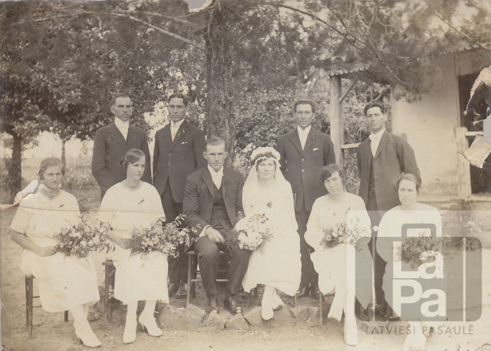 Augusta Kļavas un Emīlijas Sproģis kāzas 1923. gada 30. septembrī Fazenda Veļa (Novaodesa). Aizmugurē no kreisās stāv: Gustavs Kārkls, Ernests Sproģis, Žanis Sproģis, Roberts Krepliņš. Priekšā no jaunā pāra pa labi sēž līgavas māsa Emma Sproģis.