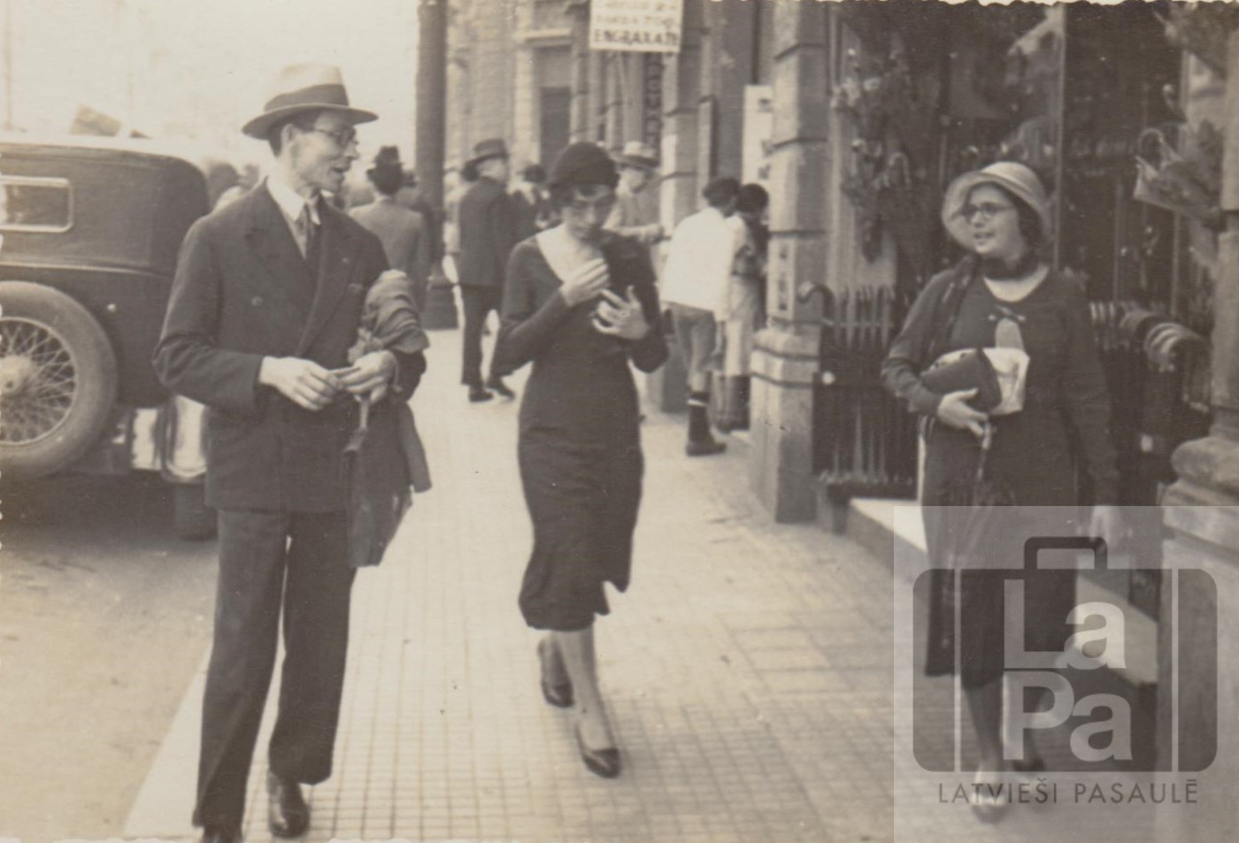 Latviešu baptisti Žanis Sproģis ar māsu Emmu pastaigājas pilsētas ielās. Sieviete labajā pusē nezināma.