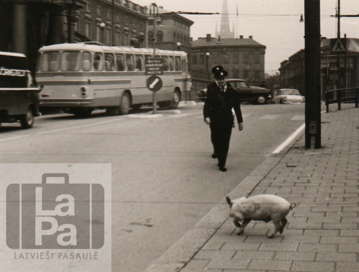 Policisti mēģina noķert palaistu sivēnu (saukts arī par "sarkano sivēnu"), uz kā uzzīmēta Hruščova karikatūra, pretpadomju saukļi un kam apsiets sarkans karogs. Protesta akcijā piedalījās Vija Pole (Freimane), Jānis Veidemanis, Jānis Brēdermanis u.c. Sivēns tika palaists Hruščova viesošanās laikā Stokholmā, 1964. gada jūnijā, netālu no karaļa pils. Sivēns bija ieziests ar eļļu, lai to grūtāk noķert.
