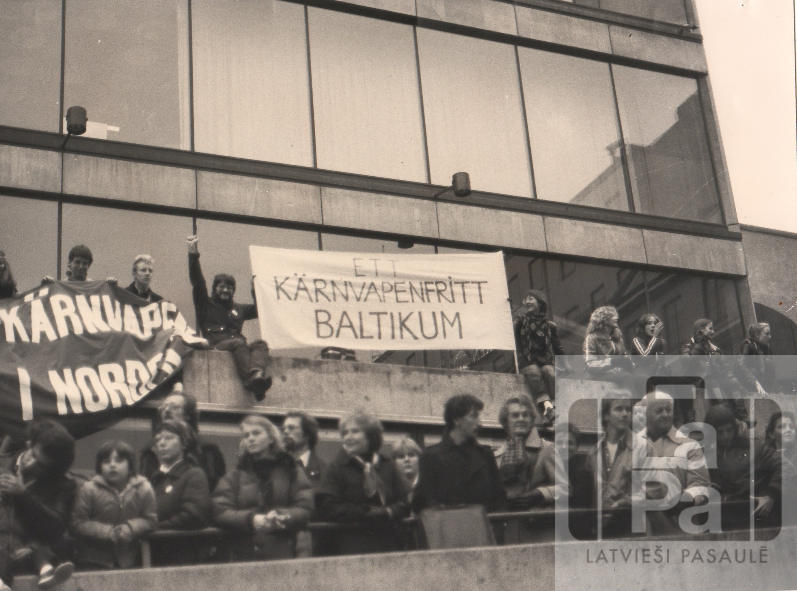 Latvijas Sociāldemokrātiskās strādnieku partijas Zviedrijas nodaļa piedalās 1. maija gājienā Stokholmā, Zviedrijā. Plakāts zviedru valodā aicina atbrīvot Baltijas valstis no kodolieročiem. Kreisajā pusē plakātu tur Atis Lejiņš.