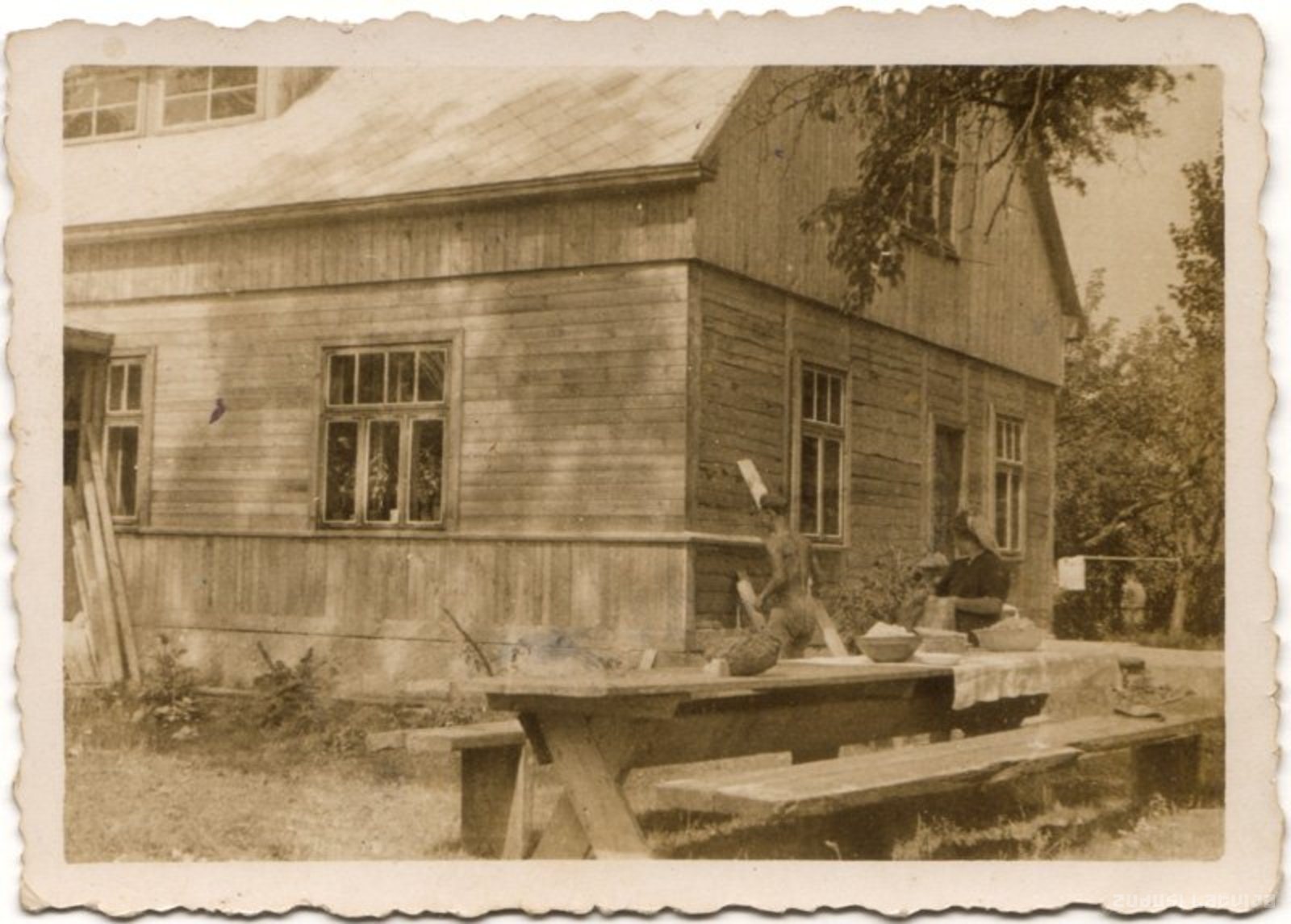 Mājas pagalmā galds, ar krusta kājām un soliem, saklāts strādnieku ēdināšanai